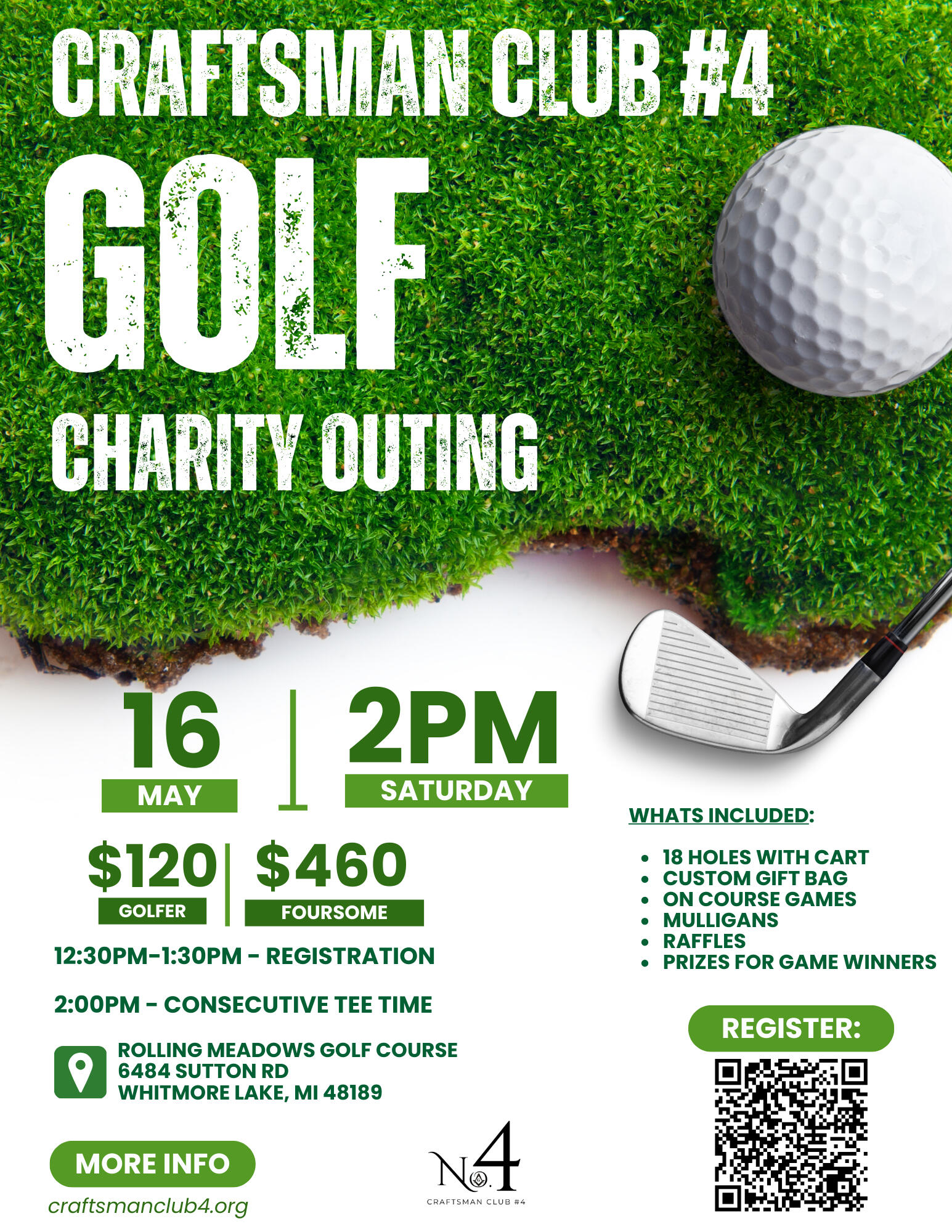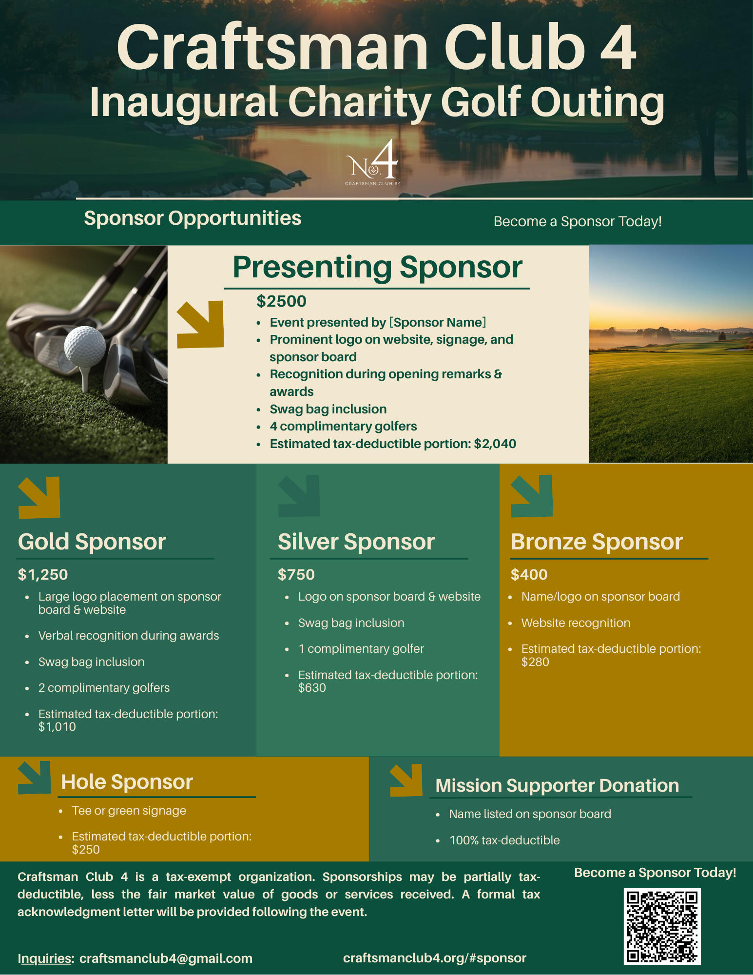Join us for our inaugural golf outing at Rolling Meadows Golf Course! Sponsorships are a great way to showcase your business, engage with local professionals, and support the mission of Craftsman Club 4. As a tax-exempt organization, your sponsorship may be partially tax-deductible, and all sponsors receive a formal acknowledgment letter.