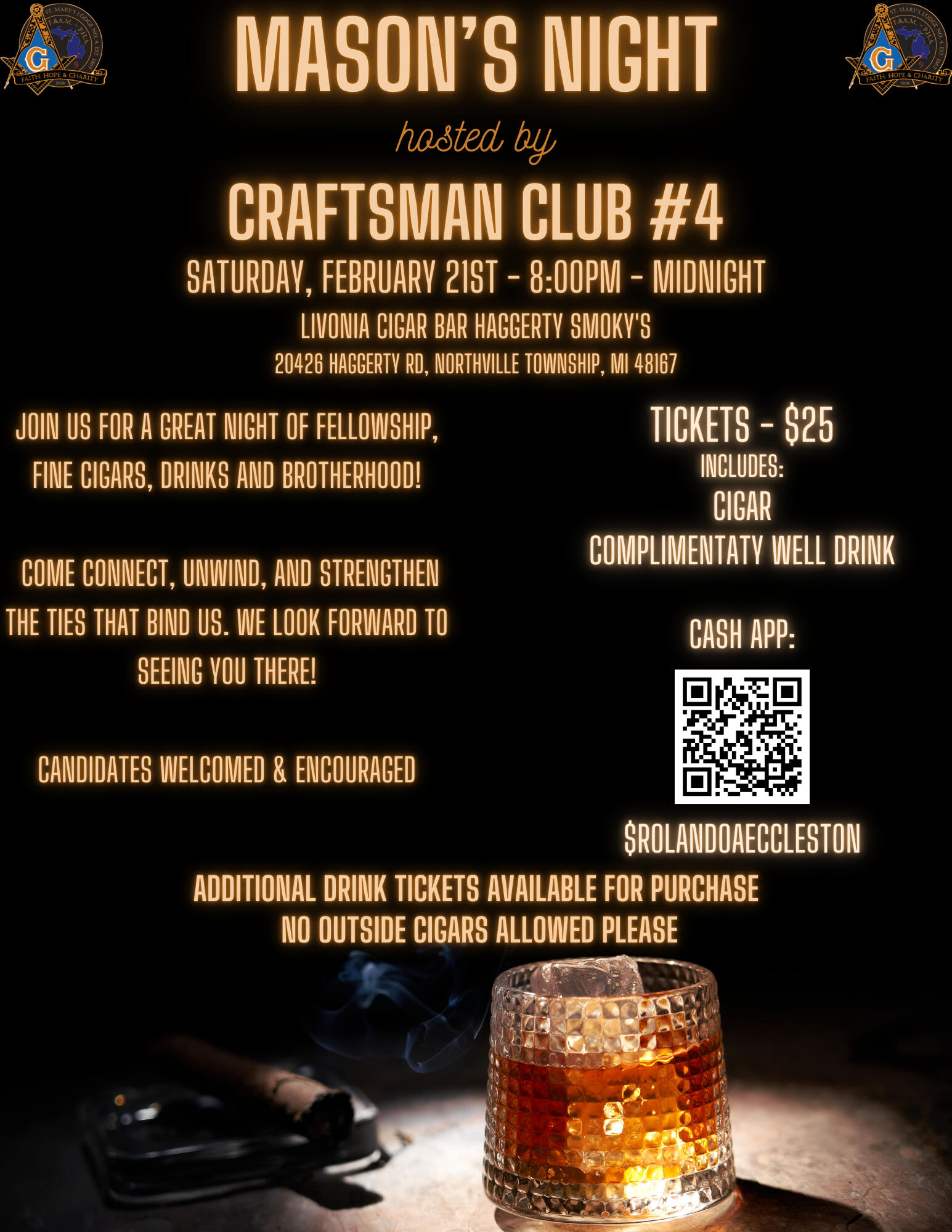 Mason’s Night at Livonia Cigar BarJoin Craftsman Club 4 for a relaxed evening of fellowship, good conversation, and great cigars at the Livonia Cigar Bar. This casual get-together is the perfect chance to unwind, connect with brothers, and enjoy the comfortable atmosphere of one of the area’s favorite lounges.Whether you're a seasoned cigar enthusiast or just curious to learn more, all are welcome. Come share stories, build friendships, and enjoy time together outside the lodge.